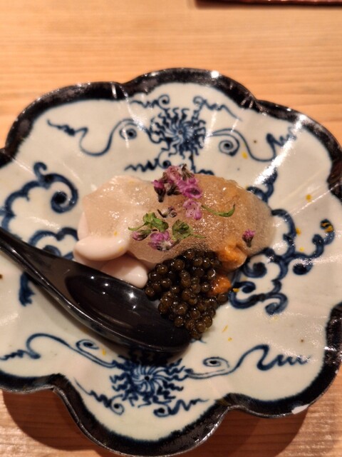 真鱈白子+紫うに(姫島産)+キャビヤ添え かなり美味