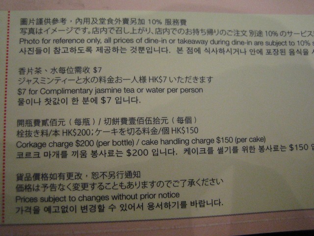 栓抜き料金200HK$???(≒2200円!)ケーキを切る料金150HK$!?(≒1650円!!)