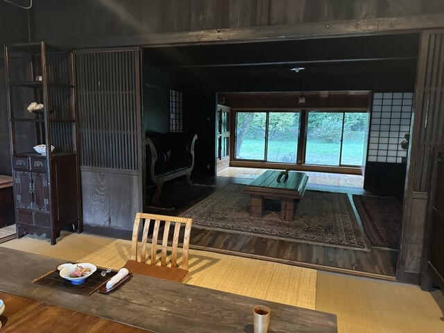 続き座敷の向こう側にピクチャーウィンドウの如くの美しい木々の緑。
