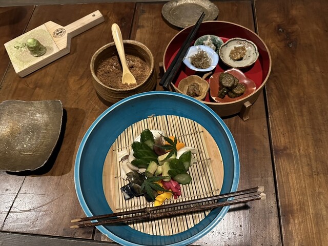 隣に味噌蔵?がある景色を楽しみながら頂くアミューズは