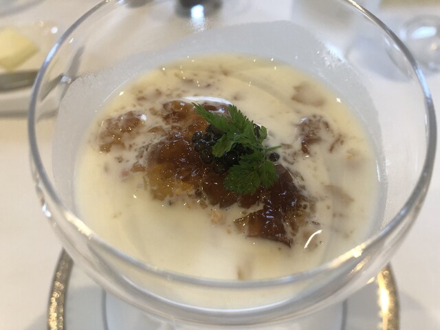 オマール海老のコンソメジュレとカリフラワーのヴルーテ 函館産ウニと温泉卵 キャヴィア添え