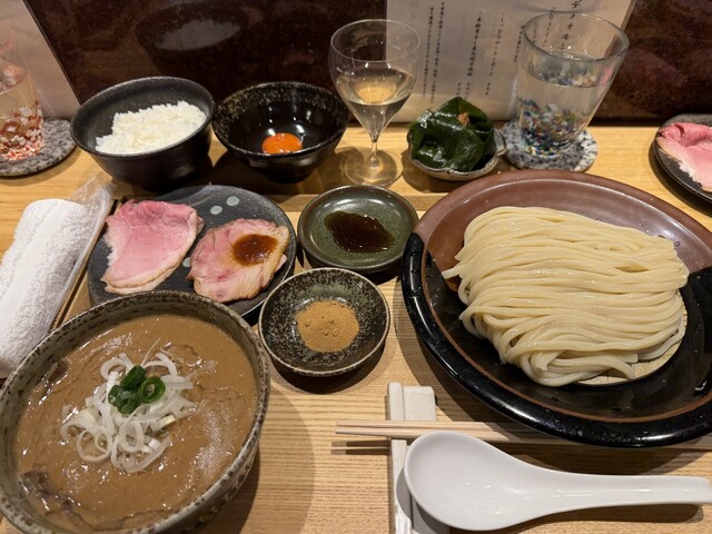 「濃厚豚骨魚介つけめん(中・お出汁割り付き)」(2000円)+「生卵」(100円)+「小ごはん(魚沼産こしひかり)」(200円)+「魚粉」(100円)+「つけダレちょい増し」(150円)+「白ワイン」(山梨県甲州市産98wines "穀"・120ml 2600円) を注文。