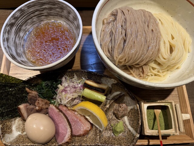 特製鴨出汁つけ麺+炙り鴨肉と鴨挽肉丼
