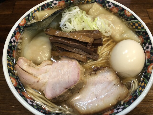 トッピングは四角い雲呑、豚肩ロースの吊るし焼きと煮豚のバラ肉の2種のチャーシュー、メンマに味玉と豪華で食べ応えがあって美味しく、コストパフォーマンスも素晴らしい。