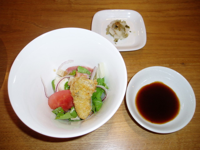続いてサラダであったがこの時期のサービスとして鳥羽産のカキフライが一つ添えられている。