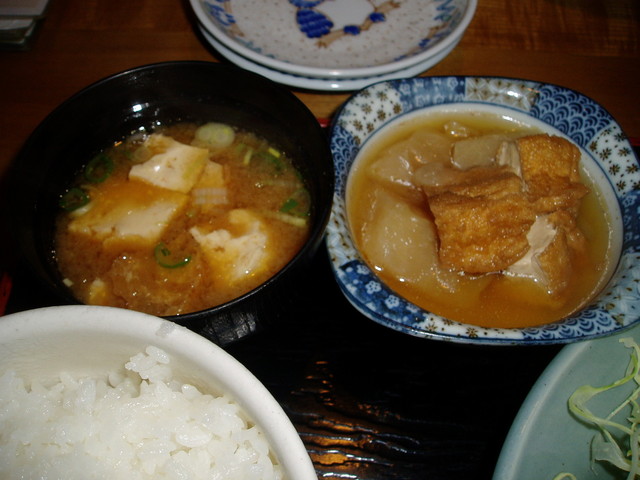やはり豆腐屋さんらしく、豆腐とお揚げの味噌汁に大根とお揚げを煮たもの、ご飯と漬物、そしてメインのから揚げという内容。