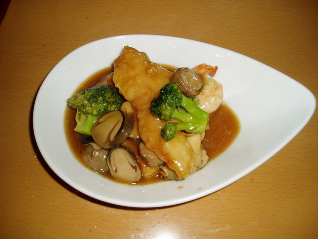 飲茶セットのメインは海鮮と揚げ豆腐のオイスターソース煮にてキノコ類や白身魚、揚げ豆腐が煮込まれておりお味も上々。