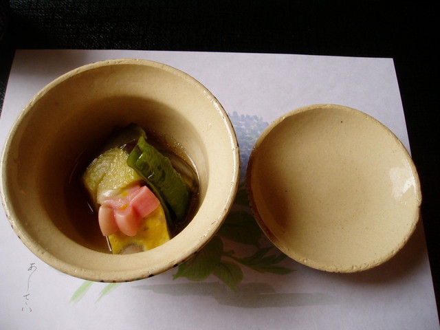 次にナス、ピーマン、小芋を玉子で包んだ炊き合わせが運ばれてきた。