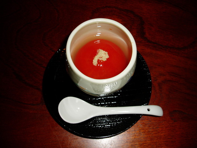 かぶら蒸しのトマト版のようなニュアンスにて酸味が美味しくトマトがトロトロで凝った料理という感じ。