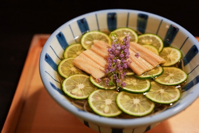 昨年いただいた「穴子の白焼とスダチの淡麗塩そば」に感動し、今年も楽しみにしていた「う月」さんのすだち蕎麦。