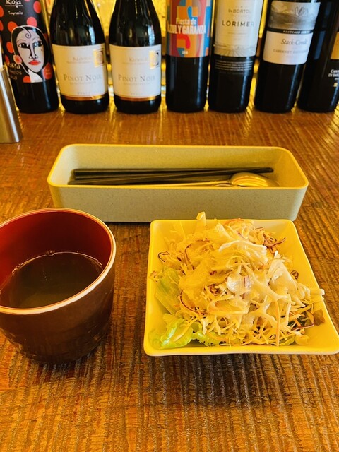 ★最初に供されるスープとサラダ スープは熱々で、ワカメとたくさんのゴマが入っています。
