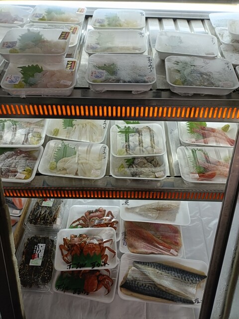 次に刺身と惣菜を見に行き、地物っぽい鯵と鰆の炙りを手に取り、男性へ伝える。