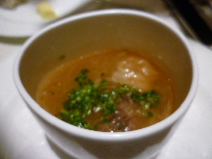 特注のお料理です。揚げ大蒜とオニオンと共に数時間も煮込んだスープです。