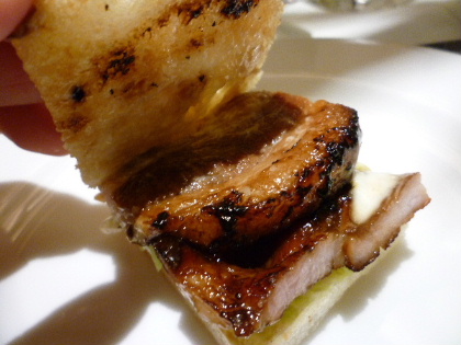 この日は恒例の女子会。特別ゲストやなもり農園のくろちゃんも迎えて(というかほとんど主役ですが・・・)“キハチ 梅田店” にお邪魔しました。いつもながらゴージャスな入口です。この日通されたテーブルはキッチンに最も近い円卓!上には鈴木シェフの手書きのレシピが照明のインテリアとして使われています。お洒落〜〜この日は鈴木シェフがこの方の要望を聞いてくださり特別メニュー!この方(下にも写ってますが)が・・・といえば、何が中心かわかりますよねぇKIHACHIグラスでかんぱ〜い【バケット】【鹿児島黒毛和牛のカルパッチョ】ナスタチウムやマローやらハーブが香り、薄く切った和牛がつるんと喉に入ります。【南昌豚肉のしゃぶしゃぶ風サラダ】この日はお肉も主役ですが、お野菜もそれに負けじと主張しているようです。生姜風味のドレッシングでいただくと、いくらでも食べれそう。クリックしたら↓大きくなります。そして、ど〜んとフライパンのまま出てきたのは鈴木シェフのオリジナル。【マッシュポテト&ひき肉モッアレラチーズのカレー風味グラタン】インドに旅行された時に見たお料理を再現されたそうです。インドでは羊肉だったらしいです。モッツァレラがトロ〜ンと伸びて、カレーの香りがフワンと香り、味もきつ過ぎなくバケットに乗せて食べても美味しい〜【テールスープ】特注のお料理です。揚げ大蒜とオニオンと共に数時間も煮込んだスープです。テールがトロトロ。 もう一度食べたいお料理です。勿論、ワインもいただきますよ。 今日はお肉がメインだから薫り高い赤でしっかり辛口フルボディの【バルバレスコ・マーニョ】で!【ジャンボハンバーグ】100%牛肉で出来たハンバーグです。お腹が一杯になりつつも、食べてしまえるあっさり感です。ジャンポマッシュルームと紫芋も添えられています。【紹興酒漬豚蒸&バジル風味ラヴィゴットソース】豚肉がやはりトロトロでバジルの風味と色が鮮やか・・・なんですが、ち、ちょっとお腹が苦しい・・・そしてまたまたド〜ンと出てきたのが【コーヒー風味の豚肩ロースのフォカッチャサンド】美味しいんですが〜お腹がぁ〜〜〜パンだけにPANPAN(汗)えっ?豚肉だけ抜き取って食べておられる方が密かにいますがぁ・・・(笑)中はこんな感じ↓コーヒー風味の豚肉、すごい美味しいです。お弁当に持って行きたいなぁ。最後はやはり特注デザートやっぱりデザートは別腹です。【葡萄のシャーベット&巨峰のスープ&ブランデー風味のアイスクリーム】最高に美味しいデザートです。あんなにお腹一杯だったのにペロッと食べてしまいました。この日もガッツリいただきました。どうやら厨房の方が驚いていたらしいです・・・だって一応女子会って言ってましたから(笑) 女子は女子でも恐るべし胃袋の女子?鈴木シェフ、お見事な腕を振るっていただきありがとうございました。忙しく、手際よく働いているスタッフの方々の姿も間近で見られ感動いたしました。“キハチ”素晴らしいお店です。最後に出口でやなもりさんのお決まりのポーズ!(暗くてごめんんさい)でも、最近ポーズ取るの上手になってきましたねぇ。ブログランキングに参加しています。ポチッっとクリックが元気の源。宜しくお願いします〜