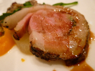 【沖縄産琉球豚2種類の部位を巻いた小さなポルケッタ梨大根のブロード煮】