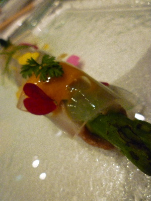 【軽く炙った寒グレの昆布〆カルパッチョを巻いた緑アスパラ