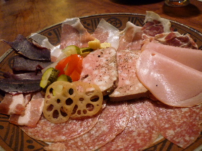 (ロースハム、ミラノサラミ、豚バラベーコン、蝦夷鹿の生ハム、パルマ生ハム、イノシシ生ハム、自家製パテ)