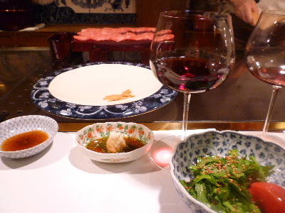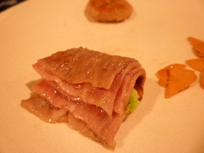 焼いて重ねたお肉にワサビやニンニクチップを挟んで・・・