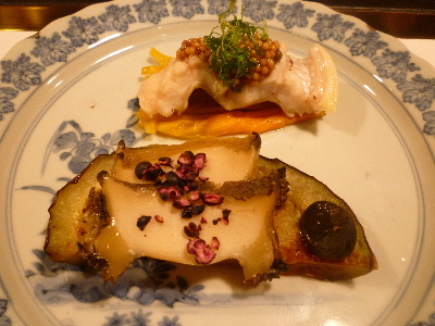 ズッキーニ、茹でると紫色になる金沢の金時草、門真の蓮根で作った蓮根餅も添えられて・・・