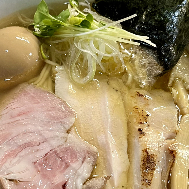 まろやかな魚介スープに味わい深い鶏白湯スープが際立つ塩味に、ネギと貝割れ大根が良いアクセント。