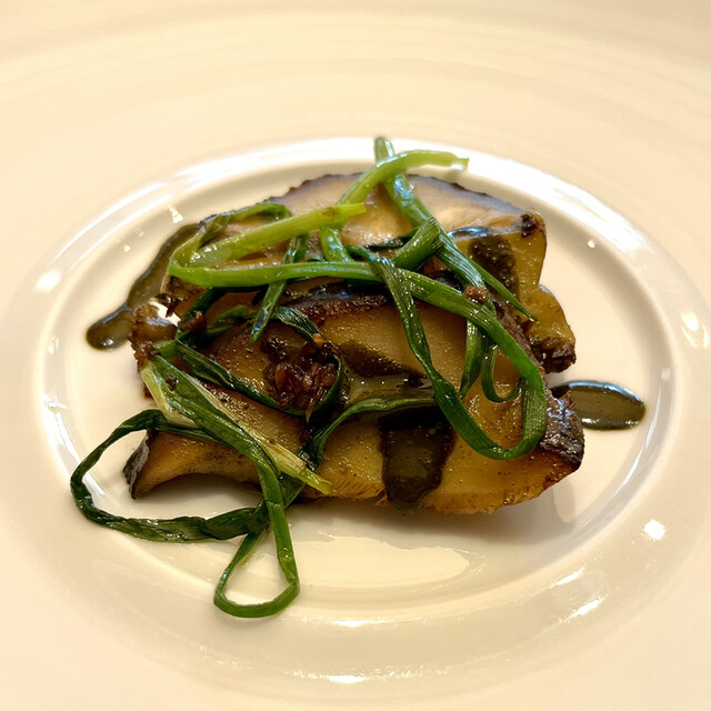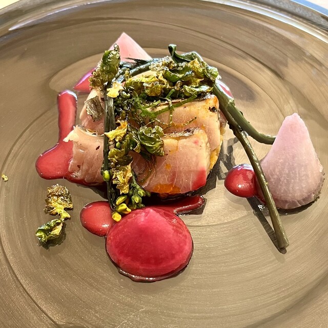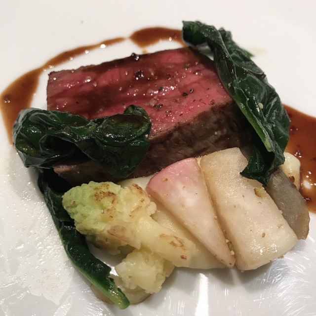 ほぼ(笑)イベリコ豚(能登でドングリを飼料に育てたイベリコ種豚)な能登豚のヒレは脂身以外の豚肉の旨さを再確認させてくれる逸品と、これに負けない根菜などの滋味深い付け合せ。