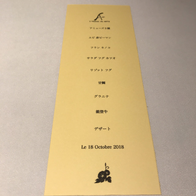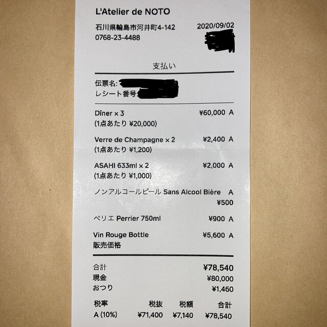 いつもの8千円台のコースを、嫁だけポーション少な目、肉料理をムリのない範囲で魚介に変更していただくように我がままを言って、グラスワイン白1杯、ノンアルビール1本、ノンアルカクテル1杯、ペリエ1本で、3万4百円弱のお会計でした。