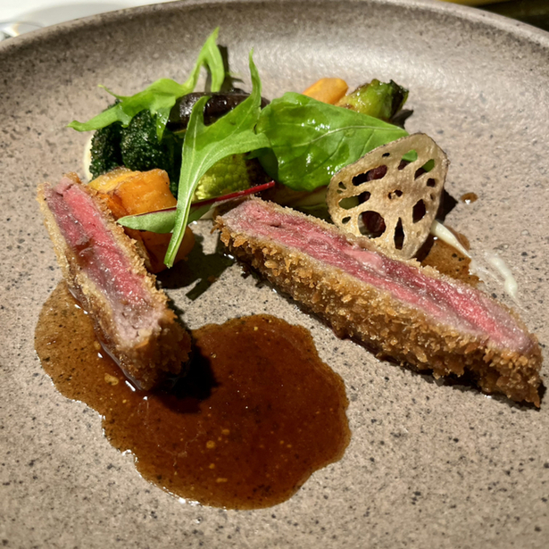 メインの牛カツとステーキは、食感も味わいも異なる2品で野菜との対比が良く食べ応えのある皿でした。