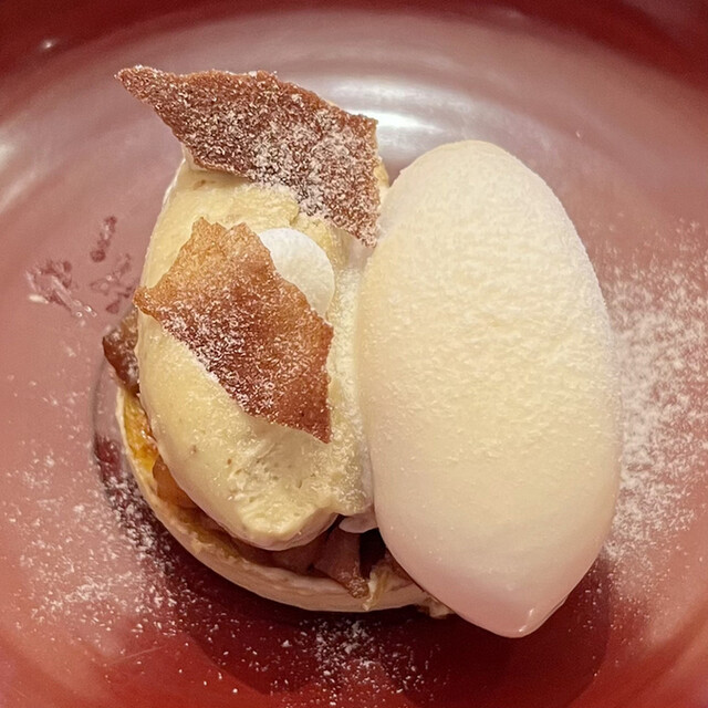 メインの牛頰肉とテールの赤ワイン煮込みは、写真のマッシュポテトが全てを繋いでくれていました。周りの根菜と共に秋の味覚を充分に感じました。