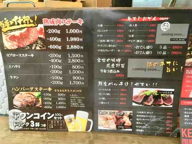 ◆(せんべろ)那覇 KEMURI 国際通り店◆国際通りから、『むつみ橋商店街』のアーケードを進む事1分ちょっと左手に見えてくるのがKEMURI 国際通り店 さん。北海道グリルスタイルと書いてあるので、スタッフさんに聞いたらオーナーさん?が北海道の方みたい。この日いらっしゃったスタッフさんも、北海道ご出身でした。北海道在住なので、少しばかり北海道ネタで盛り上がりますw普通なら、沖縄まで来て『北海道系』のお店に行こうとは思わないんですがセンベロの文字有ったら、迷わず着席ですw座ってから、メニュー眺めましたがハンバーグステーキ150g+ドリンク3杯も1,000円。大迫もハンパねぇ かも知れませんがコチラのコスパも ハンパねぇ っすw店内でも飲めますが、あえて外のカウンターに着席。この日は・鶏のコンフィ・ローストビーフ・ハラミステーキの3種類から1つチョイス。僕『ハラミステーキ』オーダーしました。1杯目のビール飲みつつ待ってるとハラミステーキ登場。センベロですからね?全くと言って良いほど期待してませんでしたがコレが至ってフツーに(普通以上と言って良いかも?)美味しいステーキでした因みに、ローストビーフはこんなカンジです。これにドリンク3杯付いて 1,000円ですからね?那覇のセンベロ界は、凄い事になってます!因みに、単品でも十分安いですよー。サク飲みでも使えますね