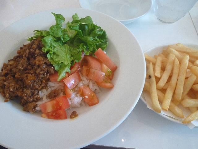 こどものキッズランチは、挽肉とトマト、サラダの乗ったタコライス。