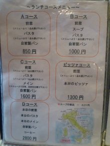 メニューは、前菜、パスタ、自家製パンのAランチ(850円)から、