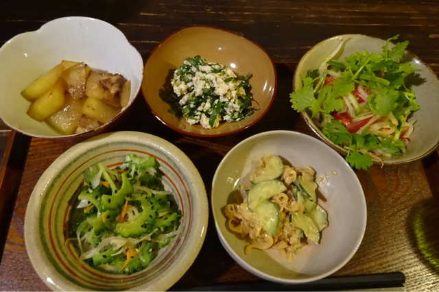 最初に出されるお野菜中心の5品に箸をつけて驚く。評判を聞いてはいたけど、沖縄の食材をいろいろ