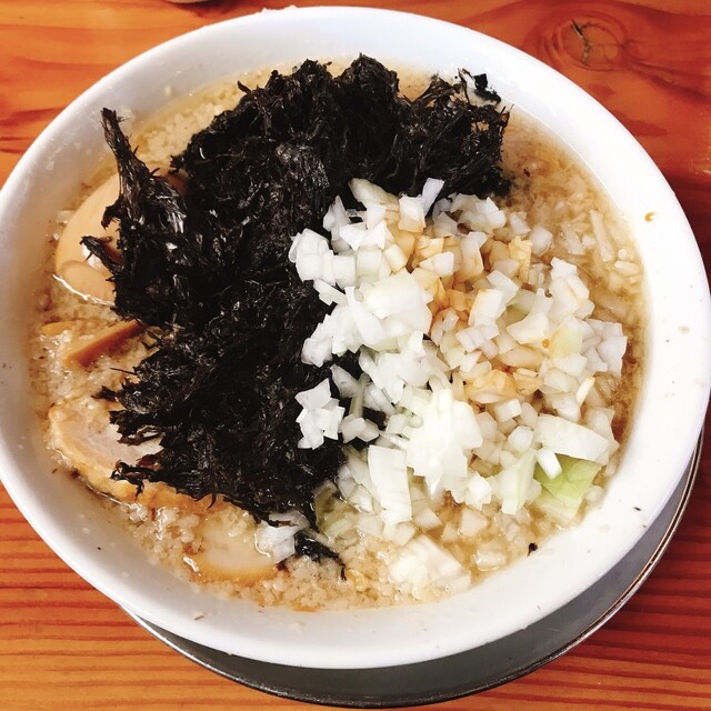背脂の甘味と刻み玉ねぎの甘味、岩海苔の磯の香りが壮絶に混ざりあい、超絶品。