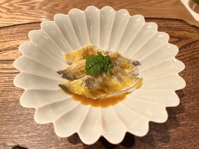 続いては、甘鯛と新銀杏を揚げてから煮浸しにしたもの。 少し甘めの味付けと衣が甘鯛の旨味と相性良く、大変美味しかったです。