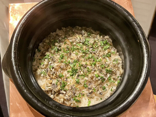 桜海老とカラスミの飯蒸し 揚げた桜海老のサクサクした食感と、よい塩梅のカラスミ、素晴らしく美味しかったです。