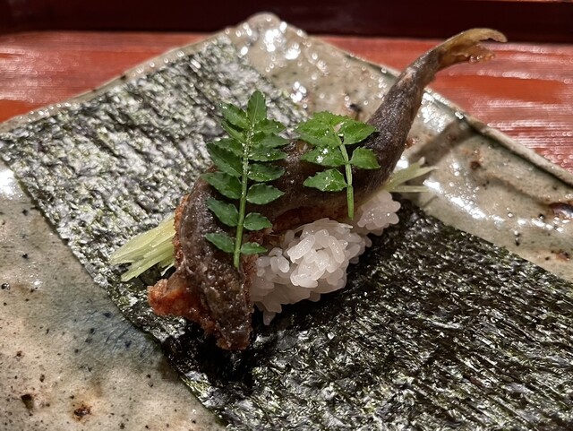 ⚫︎揚げたての稚鮎の天ぷらを、なんと海苔で巻いて、サクサク天むす☆ これは贅沢、美味しい、新しい!