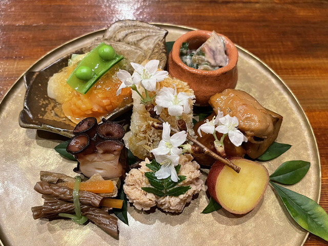 赤貝の酢味噌和え、ほうれん草胡麻和え、あん肝、まつ鯛松笠揚げ等