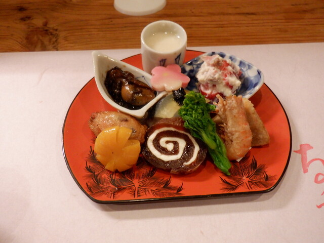 この日は大根豆乳すりながし、明石蛸の薩摩揚げ、川津海老唐揚げ、室津産牡蠣の有馬煮、菜の花の辛子和え、いわしの棒寿司、須磨海苔佃煮、金柑密煮、竹の子芋の唐揚げ、苺柚子白酢、干し柿チーズ鳴門・・・何時もながらこれでお酒が頂ける。