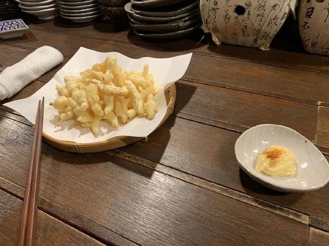 やはりこちらで食べたい1品、スルメの天ぷら・・・ソフトな歯ざわりのスルメに衣がカリこの食感とスルメの風味がいい。一味マヨで頂きました。