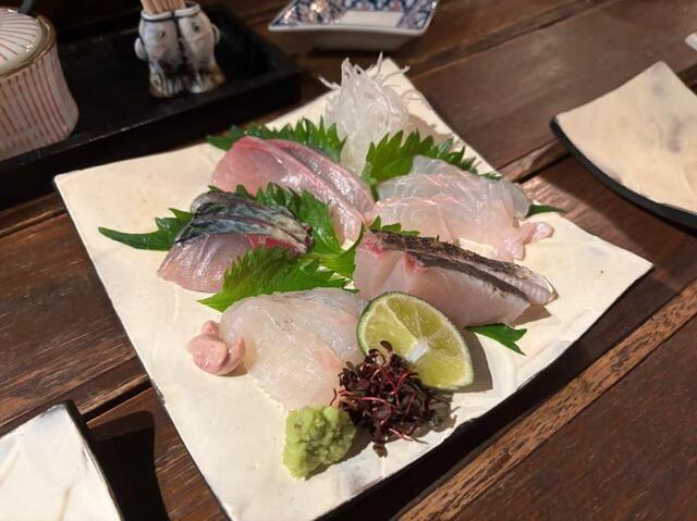 刺し身盛り合わせ、太刀魚の梅しそ挟み揚げ、ポテトサラダ、石鯛(サンバソウ)の煮付け