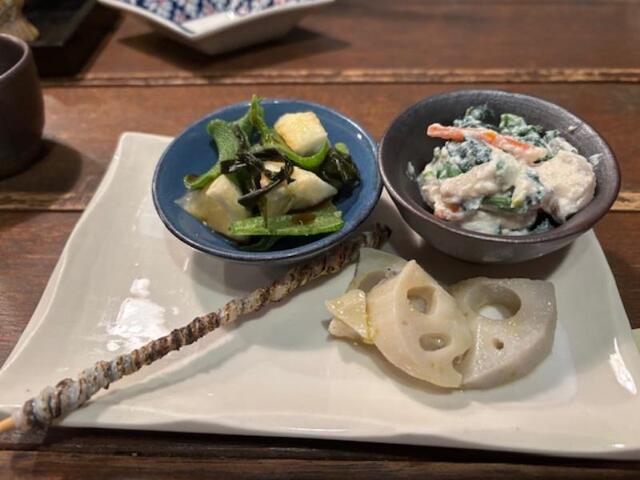 お通しが運ばれてくる・・サヨリの皮炙り、ほうれん草の白和え、蓮根のオリーブオイルマリネ、アイスプラントと日向夏の和え物の4種・・日本酒のあてにいいです。