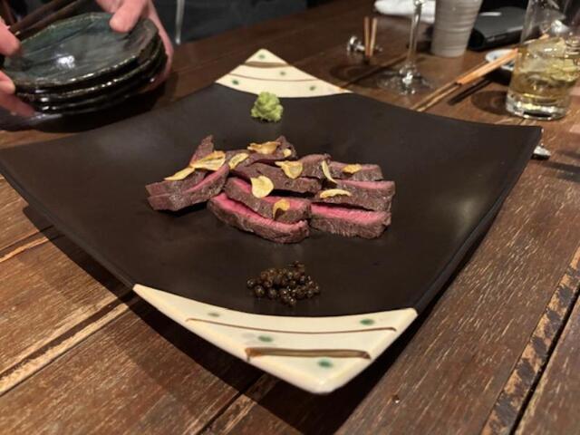 北海道産和牛ランプステーキ、ニンニク+本わさび+有馬山椒添え・・
