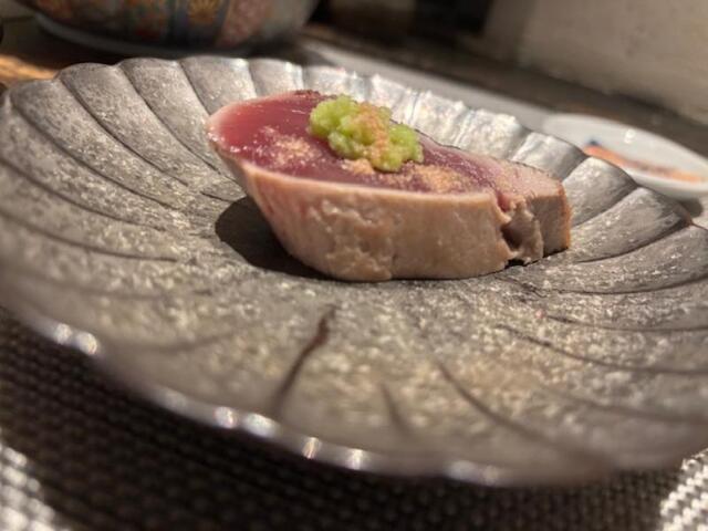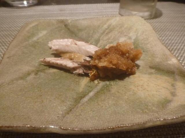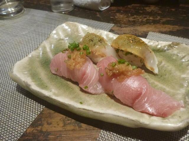 料理4品目・・・寿司スタート・・先ず淡路とらふくの握り煮詰めと山椒で、今が旬の北海道の天然ブリの握り辛味大根ポン酢に目葱トッピング