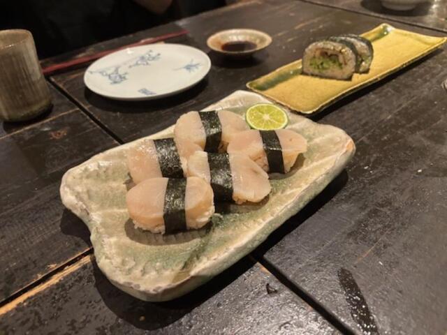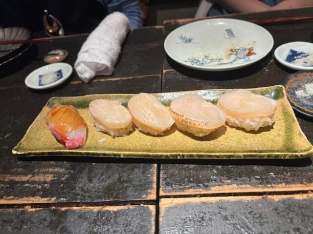 料理2品目・・・炙りホタテ寿司、器に酢飯、帆立の柱+貝紐をバター醤油で和+洋のテースト感がたまりません!