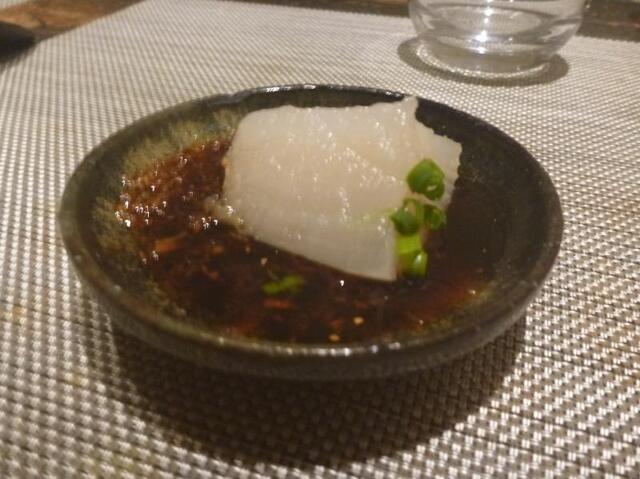 料理1品目・・・大根蒸し蟹餡かけ・・柔らかく火入れされていて旨し。