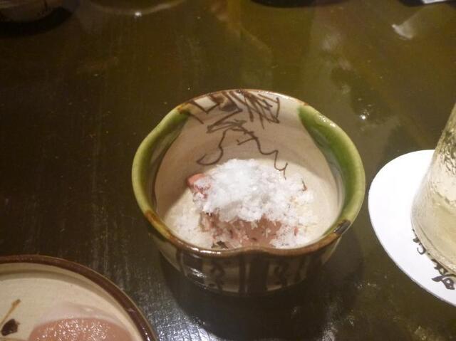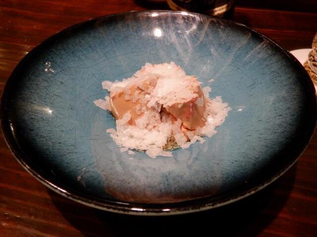 3品目は天草大王の白肝の雪塩トッピング・・脂ののりのいい・・