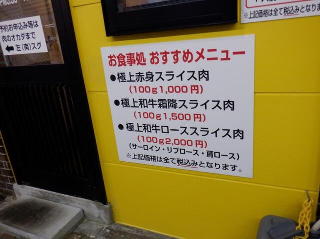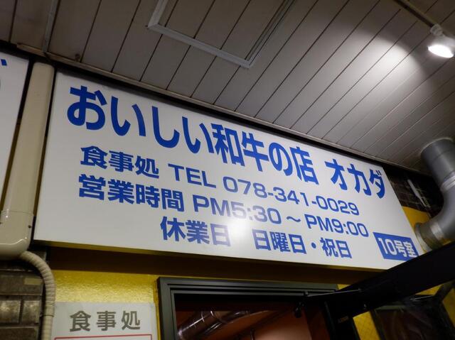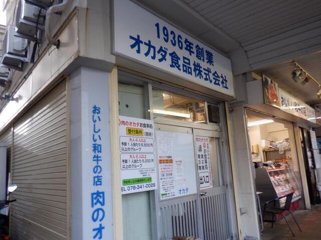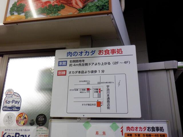 お店はお肉屋さんの2F、3F、4Fにお食事処オカダはあります。入り口はお店に向って右の路地を入った所です。