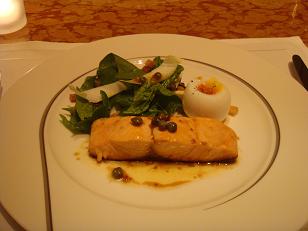 アトランティックサーモンの軽いソテー、半熟玉子ベーコン新ジャガとほうれん草のサラダ仕立て、アンチョビとケッパーのヴィネグレットと共に