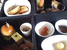 紅茶もコーヒーも、ともに3杯くらい飲める量。お重の右手前にあるお皿は、スコーンにつけるジャムなど。
