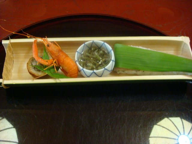 鮎押し寿司、じゅんさい、手長えびの塩焼き、穴子の八幡巻き